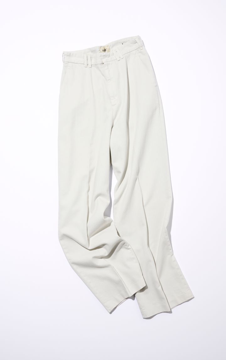 高品質なジャパンメイドのデニムで知られるSERGE(サージ)のホワイトデニム。薄く軽い生地でデニムの窮屈さとは無縁。ゆるっとしたシルエットで、風通しもよく夏でもさらりと穿きこなせます。生地には和紙を混紡しており、和紙の吸水速乾性とドライなタッチを生かしたうれしい生地。暑さでおしゃれが二の次になってしまう酷暑シーズンに備えておきたいアイテムです。デニム¥27,500(SERGE de bleu)