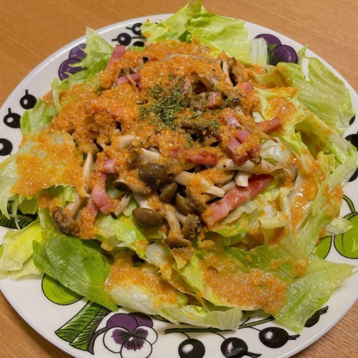 ラタトゥイユの副菜にぴったりな、ガーリックの効いたサラダです。炒めたベーコンとしめじを乗せれば、食べ応えもバッチリ。あと一品ほしいときに簡単に作れておすすめです。