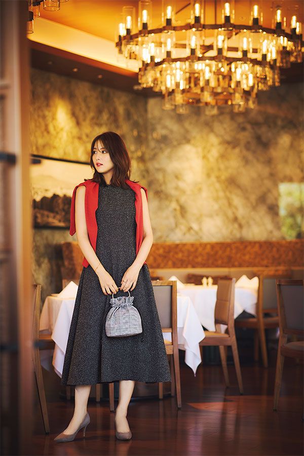 カーディガン¥6,930/MISCH MASCH ワンピース¥11,990/クチュール ブローチ、バッグ¥3,628/grove(ともにワールド プレスインフォメーション) ブレスレット¥45,100、リング¥86,900/ともにケンゴ クマプラス マユ(ヴァンドームヤマダ) シューズ¥30,800/銀座かねまつ(銀座かねまつ6丁目本店)