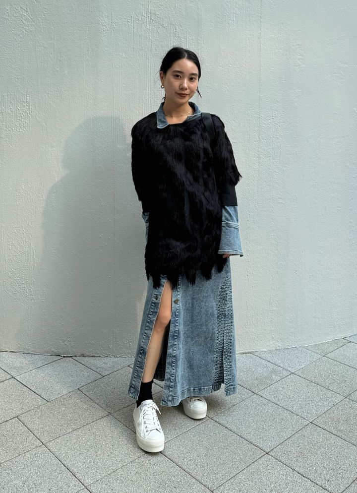 「秋を意識して、デニムシャツドレスに毛足の長いフリンジアイテムをレイヤードしました。トップスが重ためな印象なので、深く入ったスリットでヌケ感を出してバランスを取りました。デニムシャツドレスは羽織りとしても使えるのでこの秋大活躍しそうです」