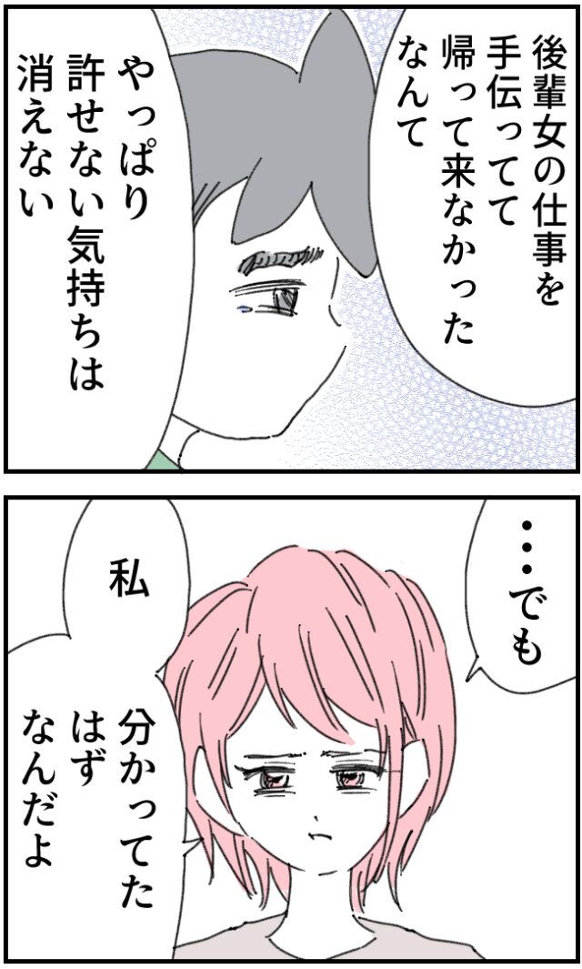 「後輩女性の仕事を手伝ってて帰って来なかったなんて、やっぱり許せない気持ちは消えない。・・でも、私わかってたはずなんだよ」