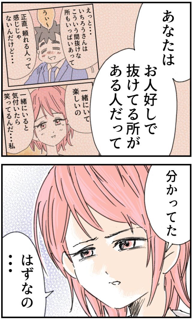 かおりさんとこはるちゃんに謝るいちろうさん、するとかおりさんが言いました。「私は・・良いママになりたかった。だから、あなたにも良いパパになって欲しかった。だけど・・その考えにとらわれ過ぎて厳しくしすぎたと思う」そして「後輩女性の仕事を手伝ってて帰って来なかったなんて、やっぱり許せない」そう言った後で「・・でも、わかってたはずなんだよ。あなたはお人好しで抜けてる所がある人だってわかってたはずなの・・」かおりさんはそう言って遠い目をしました。