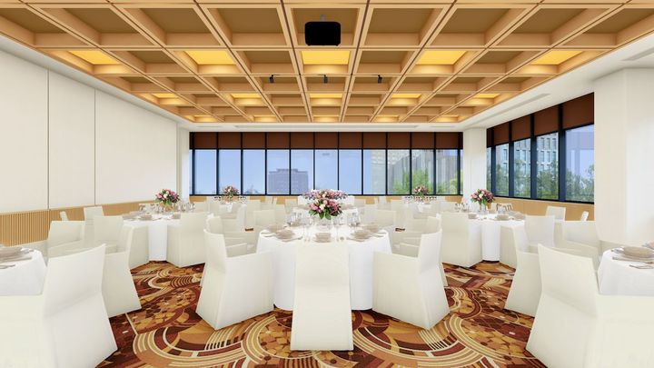 「日枝神社」に隣接する「日枝あかさか」は現在リニューアル工事中。2025年7月にオープン予定です。写真は大会場「末広」の完成予想図で、緑に包まれる本殿と、都心の街並みが望める大きな窓が特徴。この他少人数でのパーティに最適な「葵」があります。