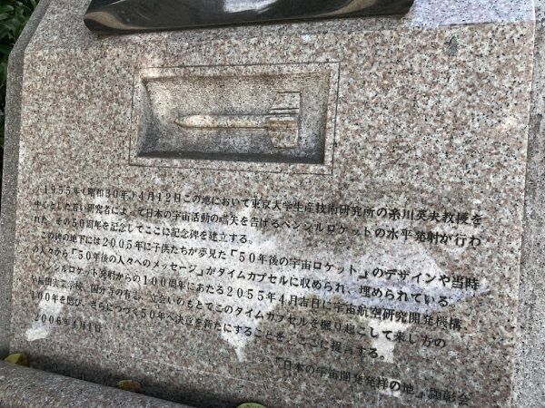 漫画家の松本零士さんがデザインしたタイムカプセルは、開発から50年後の2005年に埋められ、中には子供達が描いた「未来のロケット」のイラストや水平発射再現実験に使用された ペンシルロケット1機が入っていているそうです。そしてタイムカプセルは、ペンシルロケット水平発射実験から100周年を迎える2055年4月吉日に開封される予定だそうです。