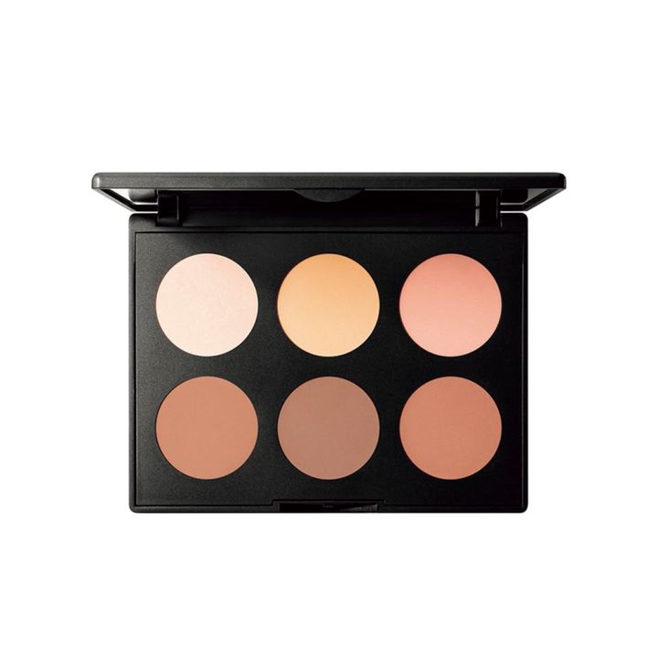 左2色をブラシでブレンドし、小鼻の脇とフェイスラインに入れ、立体感をプラス。スタジオ フィックス スカルプト & シェイプ コントアー パレット ライト/ミィディアム ¥7,590(M・A・C)