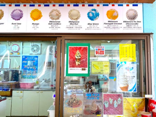 沖縄といえば! のブルーシールアイスをはじめ、沖縄の食材を使用したフードメニューの販売もあり。沖縄のお土産やうるま市限定の商品が並ぶ1階の特産品販売所では、16種類ある個売りのちんすこう(1個35円〜)も。おやつとしてドライブやサイクリングのお供にしたり、お土産のためにお好みの味を試食するのにもいいですね。