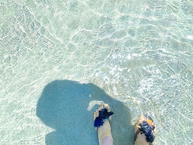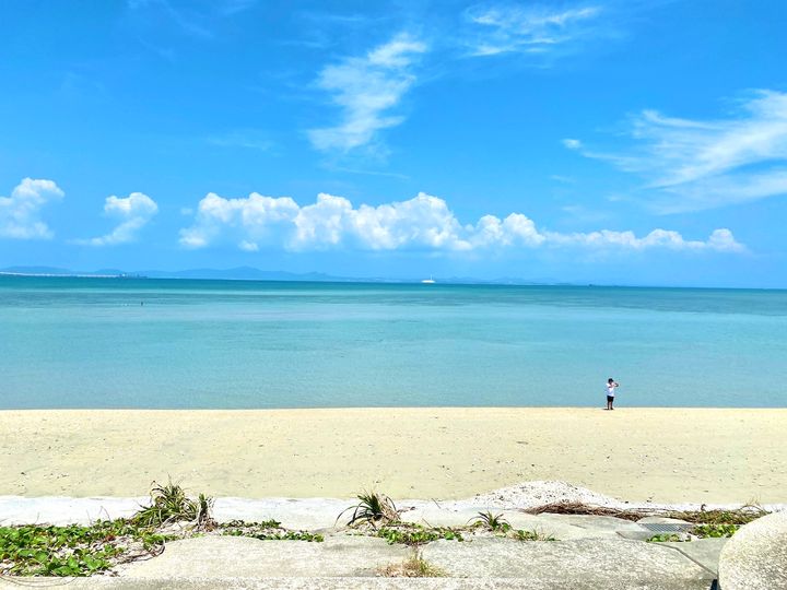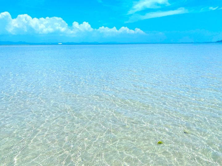 海中道路の両脇に広がる海中道路ビーチの海は、地元では東洋一の干潟とも言われているそう。潮の満ち引きで表情が変わり、干潮時には沖まで歩いて行くことができます。筆者が訪れたのは、8月の12:00頃。どこまでも浅く広がる海のあまりの美しさに、白昼夢を見ているような気分になり、言葉を失いました。