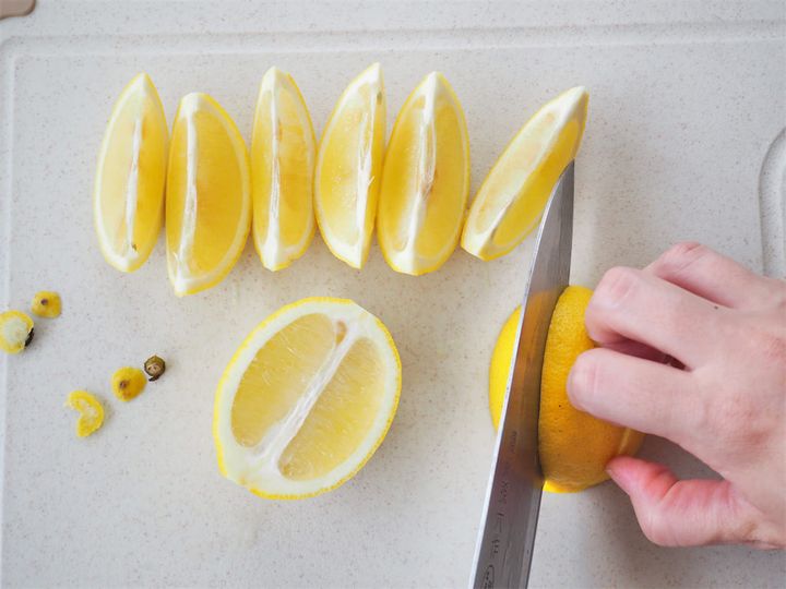 1. よく洗ったレモンを縦に6等分にし、種を取り除く。