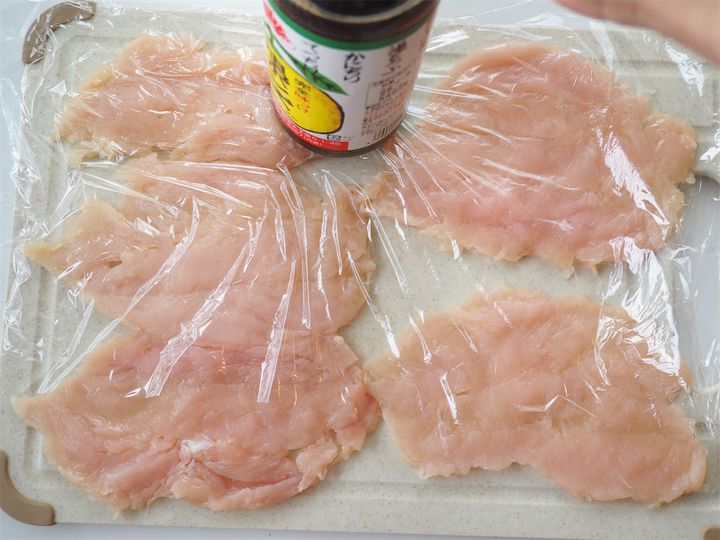 の鶏ささみ肉にラップをかけ、瓶底でたたき薄く伸ばしていく。