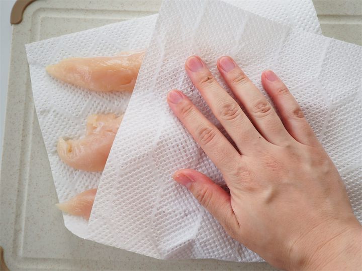 鶏ささみ肉の水分をキッチンペーパーなどで拭き取り、筋を取ったら左右に切り開く。