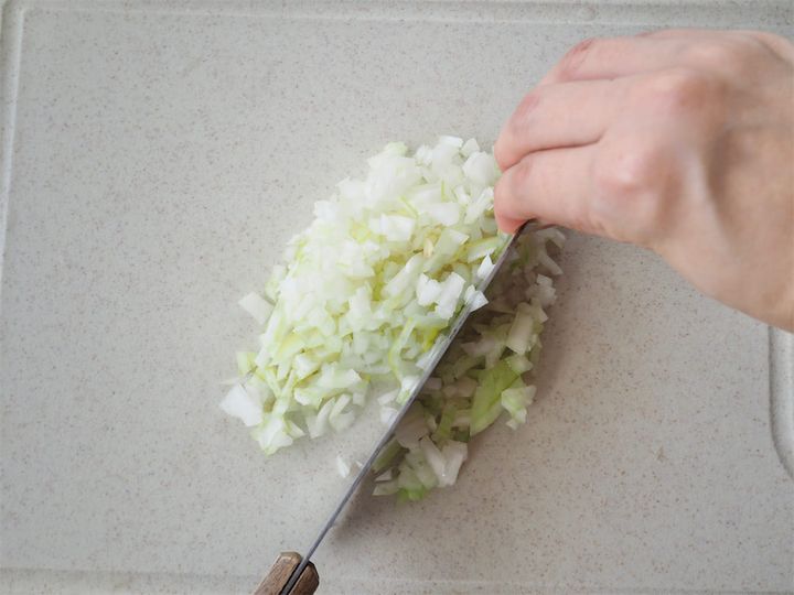 9. 新玉ねぎをみじん切りにして、水で洗う。水気を絞ってボウルに入れる。
