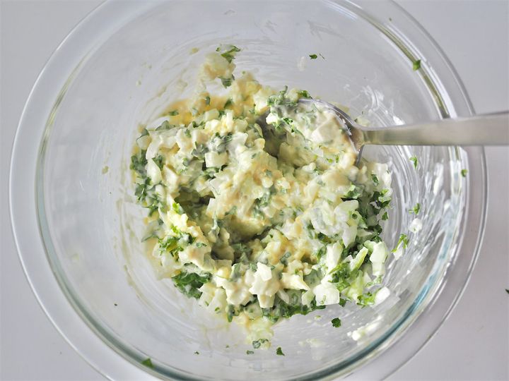 11. 10のボウルにマヨネーズ、塩レモンを入れて混ぜ合わせ、8のお皿に盛り付けたら完成!