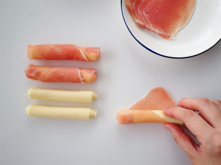 チーズ1枚につき生ハムは2枚。チーズがはみ出てしまわないように、両端は内側に包み込んでおきましょう!