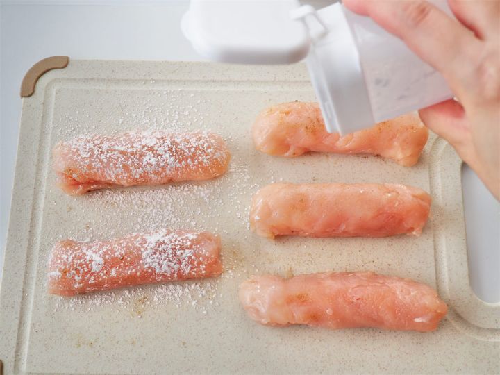 巻き終わった5の全体に塩、こしょうをふりかけ、小麦粉を軽くまぶす。