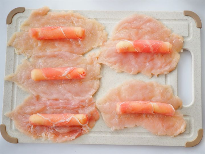 で伸ばした鶏ささみ肉の上に2を乗せ、巻きつけるようにして包んでいく。