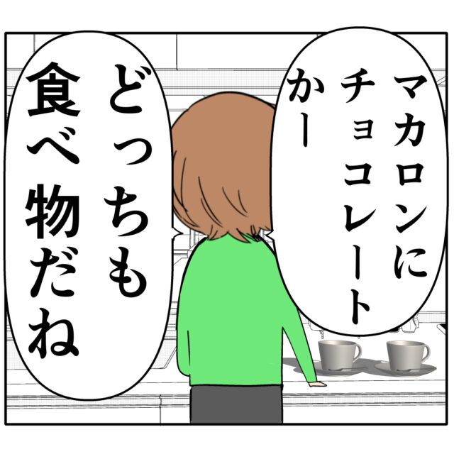 キッチンでコーヒーを淹れながら「マカロンにチョコレートかー。どっちも食べ物だね」と呟くすみれさん。