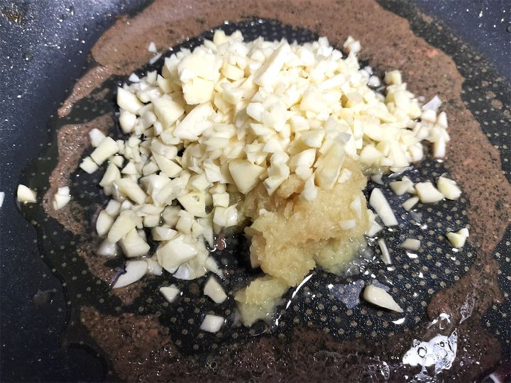 3. 牛すじ肉を別の鍋に移し、残った油ににんにくとしょうがを入れて中火で炒めます。