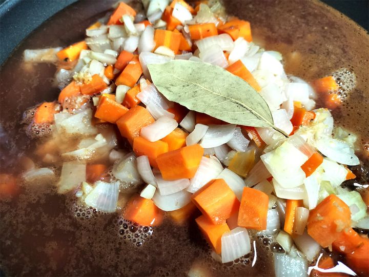 7. ワインを鍋に移し、水2L(分量外)とローリエを入れ、強火で煮立たせて黒いアクを取り、フタをして弱火で2時間煮込みます。