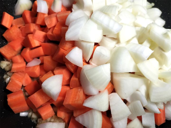 4. にんにくとしょうがの香りが立ってきたら、玉ねぎとにんじんを加えます。
