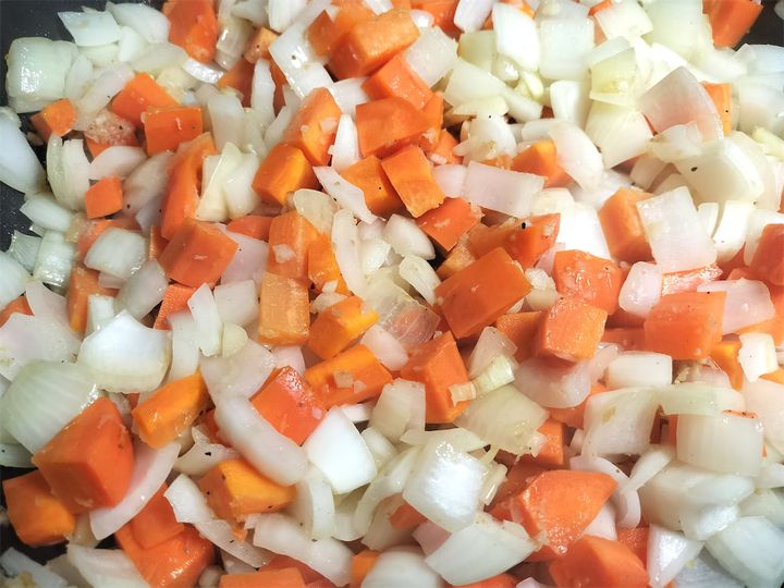 5. 混ぜながら焼き、玉ねぎが半透明になったら鍋に移します。