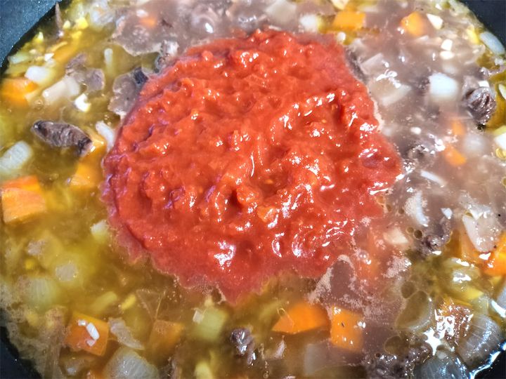 8. カットトマトを加えて混ぜ、さらに1時間煮込みます。