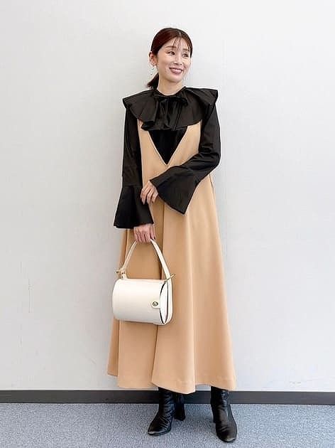 インナー次第で季節を問わず楽しめるこちらのジャンパースカート。Tシャツでもニットでも、軽やかな生地感がエレガントさを引き立てます。V字の深いカットで着痩せ効果と足長効果をも◎。甘めのブラウスとも相性が良く、STORY世代におすすめのアイテムです。