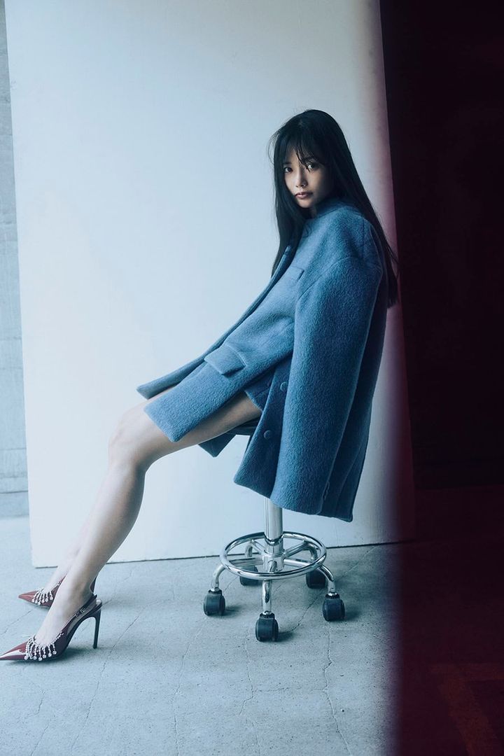 「構築的な服を着ているけれど、あえてリラックスしたI don’t careな感じの女性を表現してほしいと伝えました。そのアティチュードが、逆に潜在的な彼女のエレガントさを引き出す気がしたから」オーバーサイズコートから、すらりと伸びた脚も印象的。