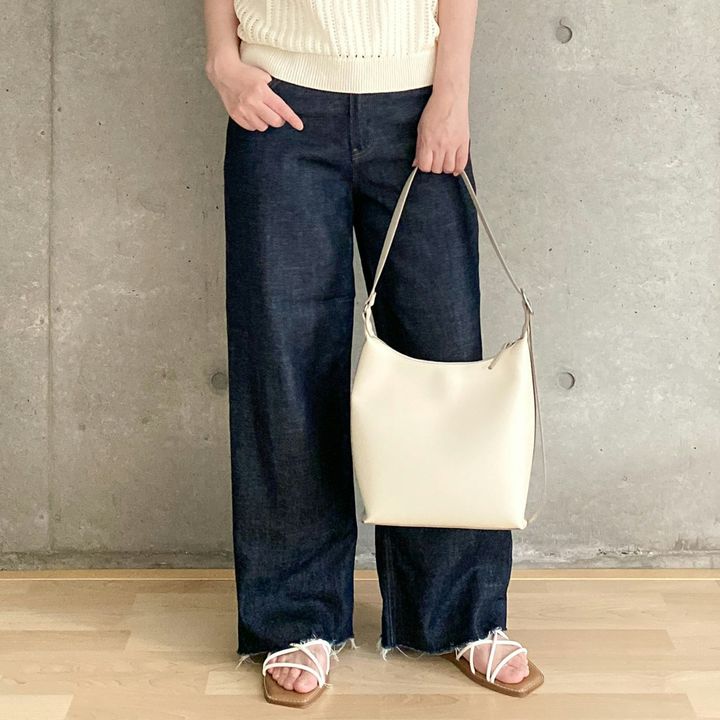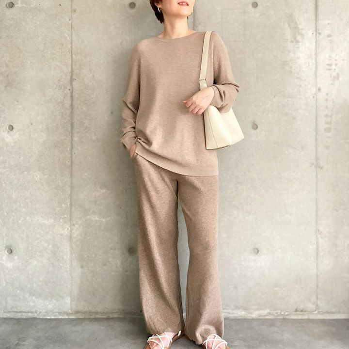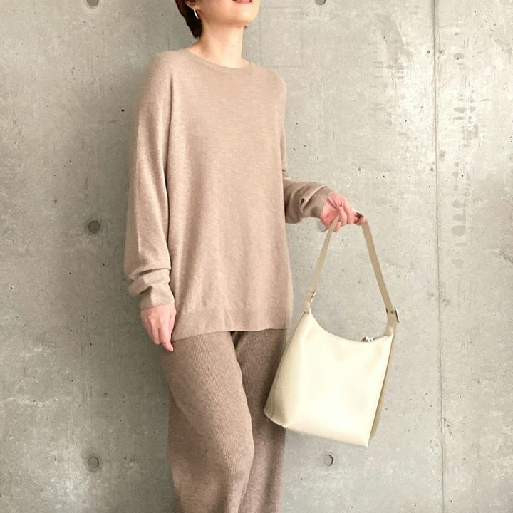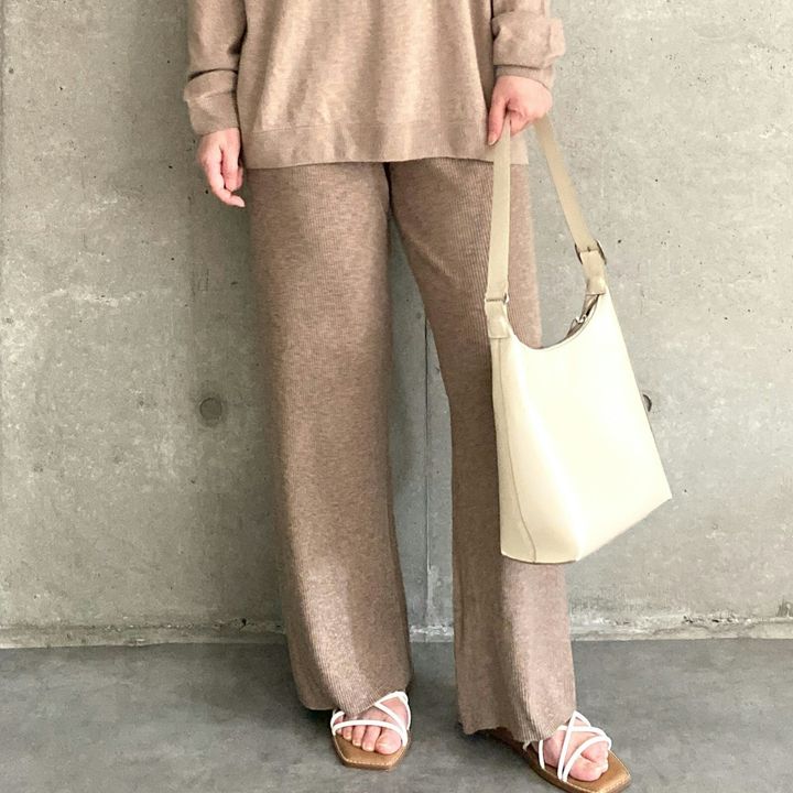 全身ニットのリラックスコーデにホワイトのバッグを合わせてみました。カシミヤのオーバーサイズのニットとリブニットパンツのゆったり感に、ホワイトのきれいめバッグがアクセントに。同じく白いサンダルで足元を軽くしています。