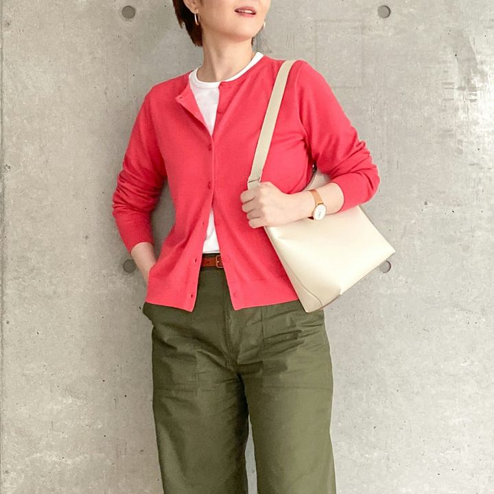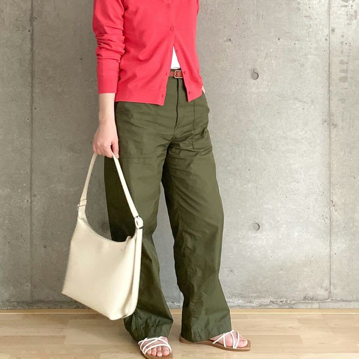 ナイロン素材のメンズライクでカジュアルなカーキのパンツ。ホワイトのバッグが引き立ちます。明るいピンクのカーディガンで女性らしい華やかな雰囲気をプラスしました。