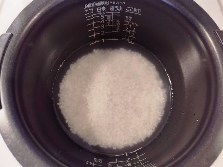 2.研いだ米を釜に入れ、目盛りまで水(分量外)を注ぎ炊飯器にセットする。