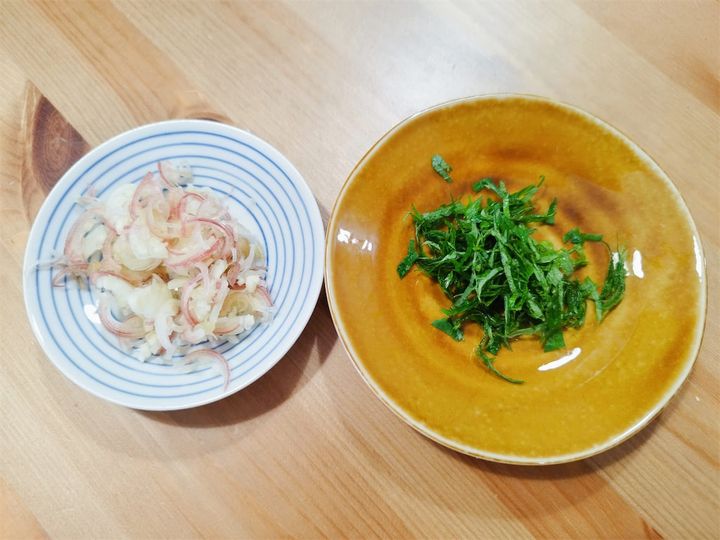 5.青じそは千切り、みょうがは縦半分に切ってから横に細かく切る。