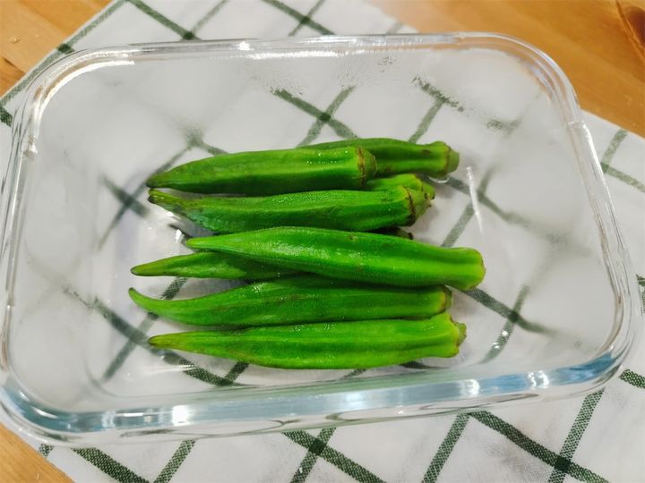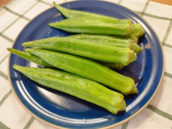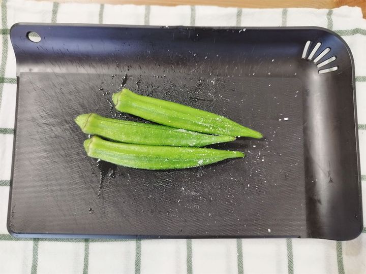 4.オクラに塩(分量外)を振り、板ずりし、産毛を取る。爪楊枝で1cm間隔に穴をあけ耐熱皿に並べ、600Wで1分20秒加熱する。