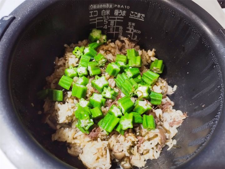 6.米が炊けたら、切ったオクラを炊飯器に入れ10分蒸らす。
