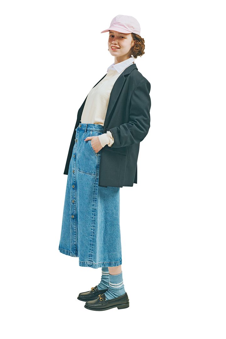 デニムスカートやキャップを合わせた、カジュアルなラガーシャツスタイル。そこへジャケットを羽織ってちょっぴり品よく仕上げるのが今の気分。どこかしっくりハマるのは、紳士のスポーツ・ラグビーのウエアだからかな?