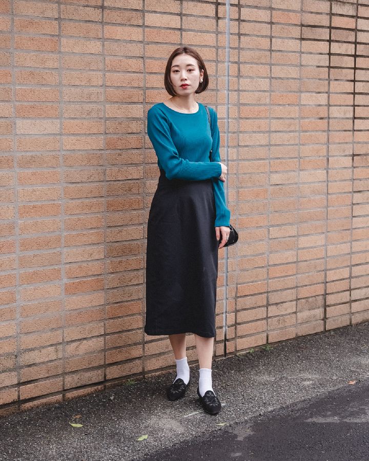 タイトで大人っぽさのあるシンプルコーデに、ソックスとローファーでトラッドにまとめて。