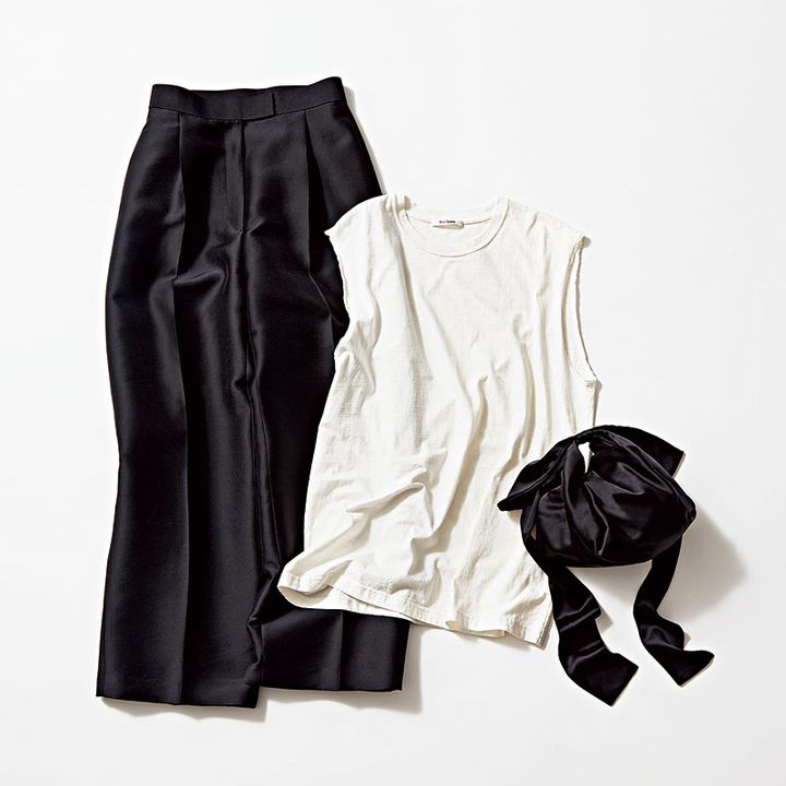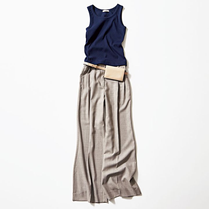 ブランドが描く知的で上品な女性像を、足元までトータルで完成度を高めてくれる。パンツ裾からちらりと覗く細ノーズとニュアンスグレーがお仕事コーデを刷新。ストラップシューズ[H1㎝]¥71,500〈ペリーコ〉タンクトップ¥12,100タックパンツ¥50,600ベルトポーチ¥50,600〈すべてエブール〉(すべてLITTLE LEAGUE INC.)