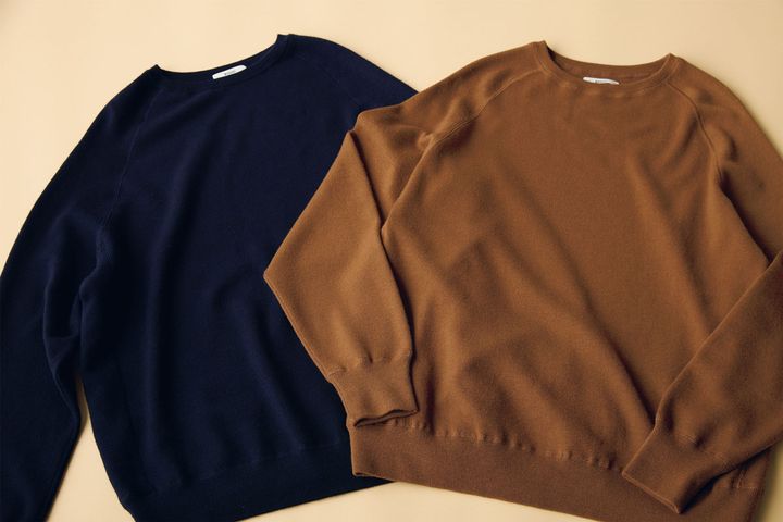 ブラウンとネイビーのミドルウェイトクルーネック各132,000円(ボーディ/アルファPR TEL:03-5413-3546)