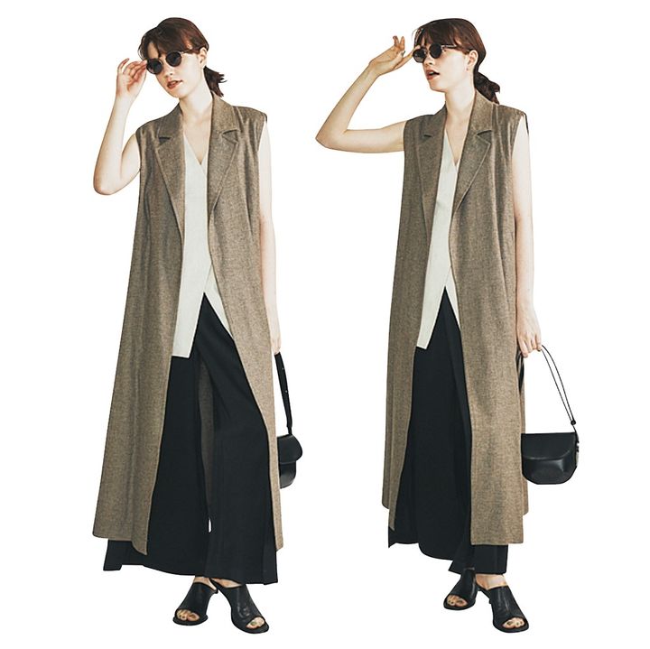 タンク感覚で着られるVネックの白ベストに、ロングジレをON。長さを変えることで、レイヤードしたときの重量感を簡単に緩和できる。正統派に仕立てるとゆるくてキレイが成立。