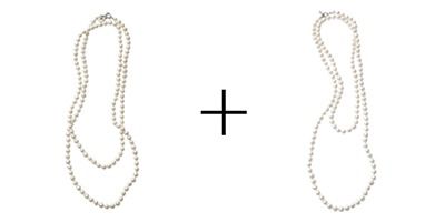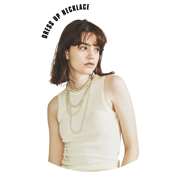 それぞれのロングパールネックレスを2連風に巻くことで、コスチュームジュエリーのような埋もれない存在感に。白濁のパールだから盛りつけても気品を保てる。白いタンクトップなど、シンプルなトップスのさっぱり感をカバーできる飾り方。