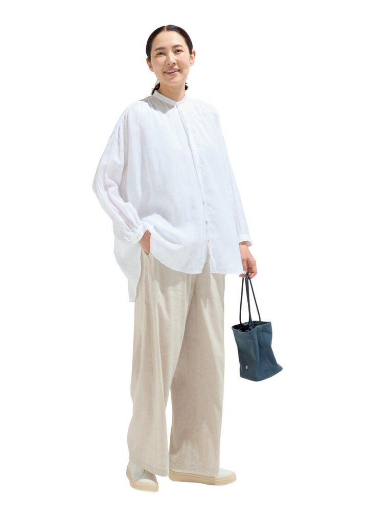 白シャツは肌なじみのいいリネンが暑い時季に◎。バンドカラーがアレンジもしやすく、こなれた雰囲気に仕上がります。パンツも落ち感のあるリネン混×広がりすぎないシルエットが万能。