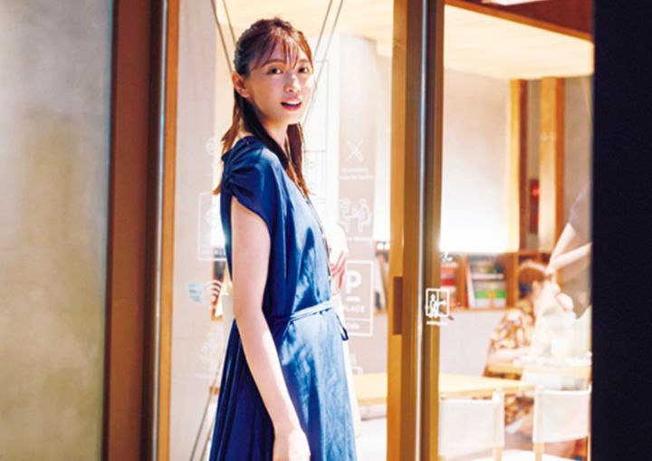 ネイビーワンピース¥22,000/マイストラーダ チェーン付きパンプス¥30,800/銀座かねまつ(銀座かねまつ6丁目本店) トートバッグ¥13,000/PLST 時計¥40,700/ココシュニック ネックレス¥33,000/ココシュニック オンキッチュ(ココシュニック)