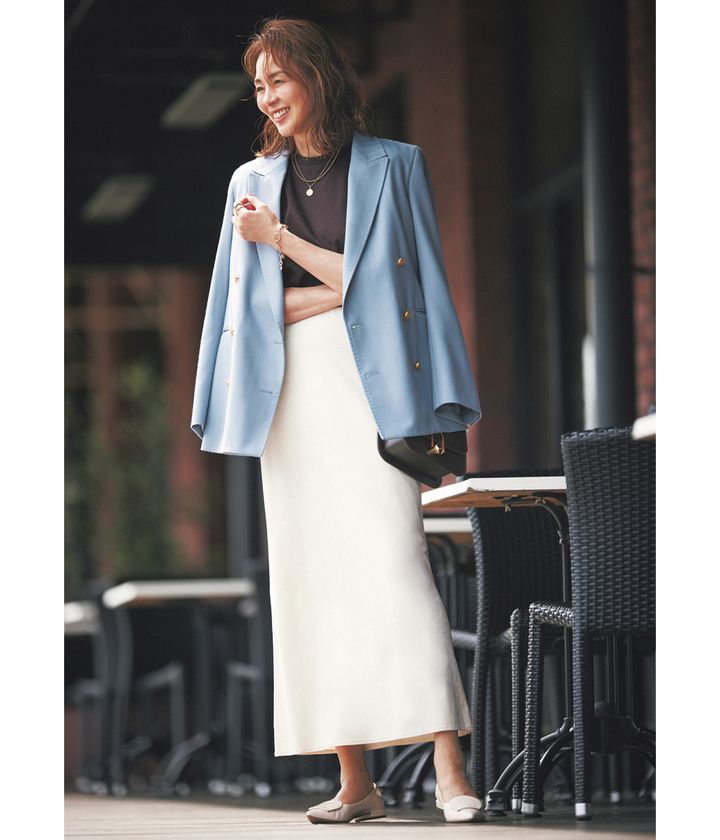 ジャケット ¥121,000(カオス/カオス丸の内)Tシャツ ¥7,700スカート ¥14,300(ともにミースロエ)バッグ ¥72,600(マエストソ/アマン)パンプス ¥39,600(ファビオ ルスコーニ/ファビオ ルスコーニ ジェイアール名古屋タカシマヤ店)チェーンネックレス ¥212,300コインモチーフ ¥77,000(ともにウノアエレ)ボールネックレス ¥33,000(シンパシー オブ ソウル スタイル/フラッパーズ)ブレスレット¥50,600(ブランイリス/ブランイリス トーキョー)リング ¥2,970(ヘンカ/ロードス)