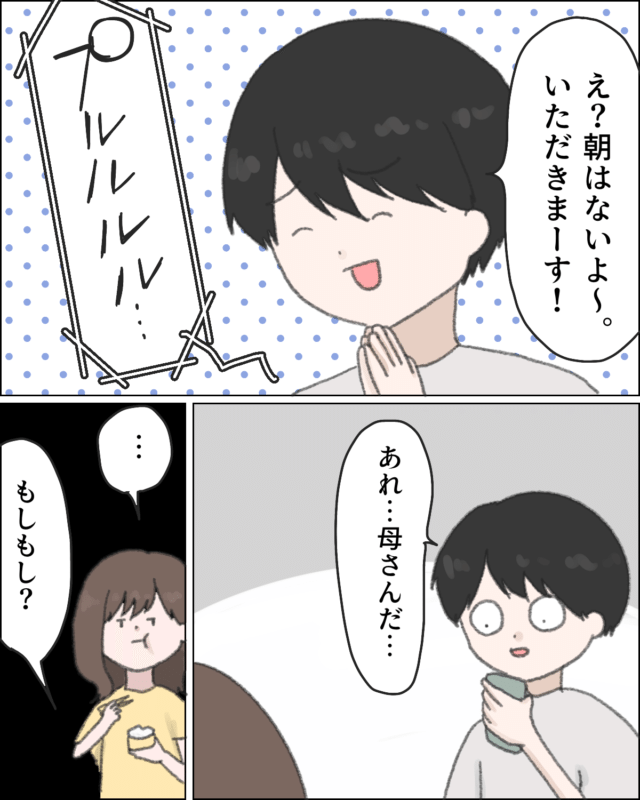 「え?朝はないよ~」そう答えたユウタさんが「いただきまーす!」朝食を食べようとしたところ、「プルルル・・・」と電話が!「あれ・・母さんだ・・」と驚くユウタさんを無言で見つめるカナコさん。そして「もしもし?」ユウタさんは電話に出ました。