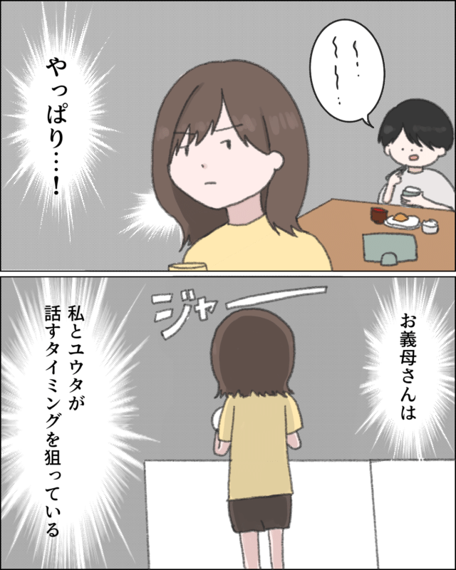 スマホで義母と話しながら朝食を食べるユウタさんを横目で見ながら「やっぱり・・!」と確信したカナコさん、「お義母さんは、私とユウタが話すタイミングを狙っている」という結論に行き着きました。