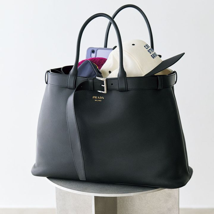 バッグ「プラダ バックル」[H34×W48×D18㎝]¥990,000※メンズ シューズ¥156,250※ともに予定価格(ともにプラダ/プラダ クライアントサービス)ブラウス¥48,400(ドゥロワー/ドゥロワー 二子玉川店)デニムパンツ¥15,180(マウジー/バロックジャパンリミテッド)バッグの中身はすべてスタイリスト私物