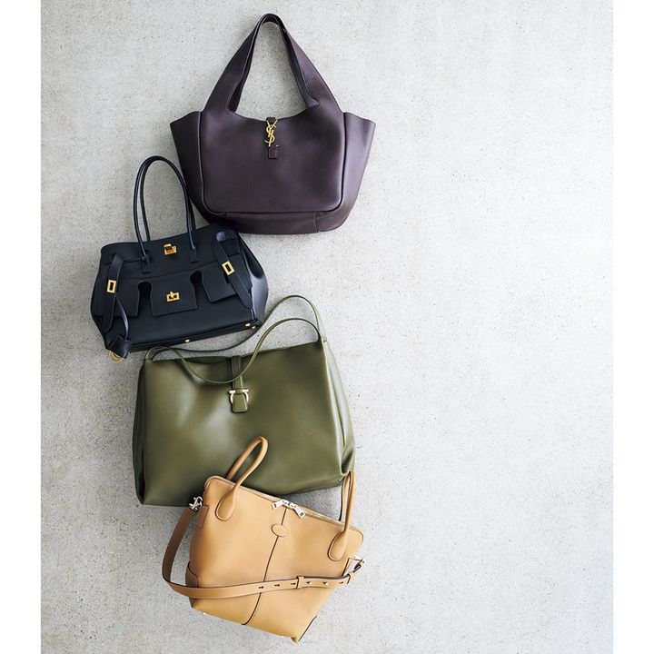 〈上から〉バッグ「ル・サンカセット ベア」[H28×W50×D18㎝]¥484,000(サンローラン バイ アンソニー・ヴァカレロ/サンローラン クライアントサービス)、バッグ「BEL AIR」[H25×W38×D17㎝]¥797,500※予定価格(バレンシアガ/バレンシアガ クライアントサービス)、バッグ[H39×W52×D18㎝]¥407,000(フェラガモ/フェラガモ・ジャパン)、バッグ「トッズ ディーアイ バッグ スウィング」[H29×W42×D18㎝]¥457,600※9月発売予定(トッズ/トッズ・ジャパン)