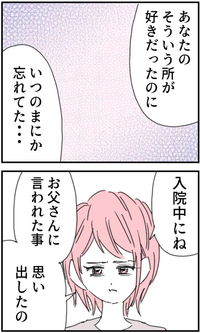「あなたのそういう所が好きだったのに、いつのまにか忘れてた・・・」と、お人好しないちろうさんが好きだったことを思い出したかおりさん。そしてもう一つ、お父さんに言われた事も思い出したといいます。
