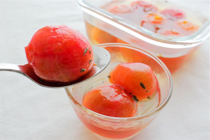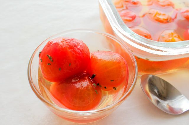 きび砂糖のシロップで漬けた「無限ミニトマト」をひと粒食べてみると…。口の中でぷちゅっと弾け、生のミニトマトにはない、圧倒的なジューシー感♡シロップの甘みを含んだ果汁が、口の中に広がります♪