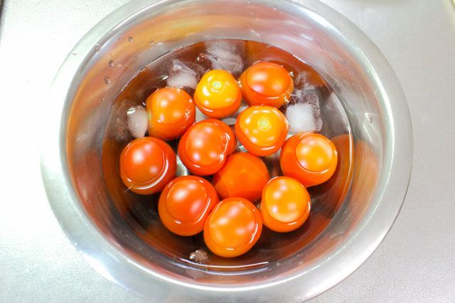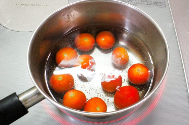 1. 鍋に湯を沸かし、気泡が立たない程度のお湯にミニトマトを浸け、皮が弾けるまで茹でます。