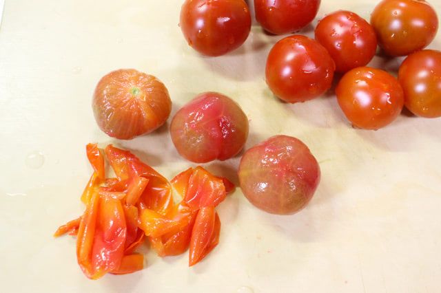 氷水に浸けても皮が弾けなかったので、包丁で切れ目を入れて皮を剥いたら、つるんと剥けました。皮を剥いたミニトマトは、耐熱容器に入れておきます。